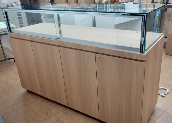 | プッシュ錠付(ガラス引戸) 腰カラー:アイカTJY2052K ストッカー(中棚1枚付)、キャスター仕様 ルーペルディスプレイスタンドLED照明付 ※ケース内寸H寸法=272㎜ ※ファインフェルト217 ベージュ色 ![]() |